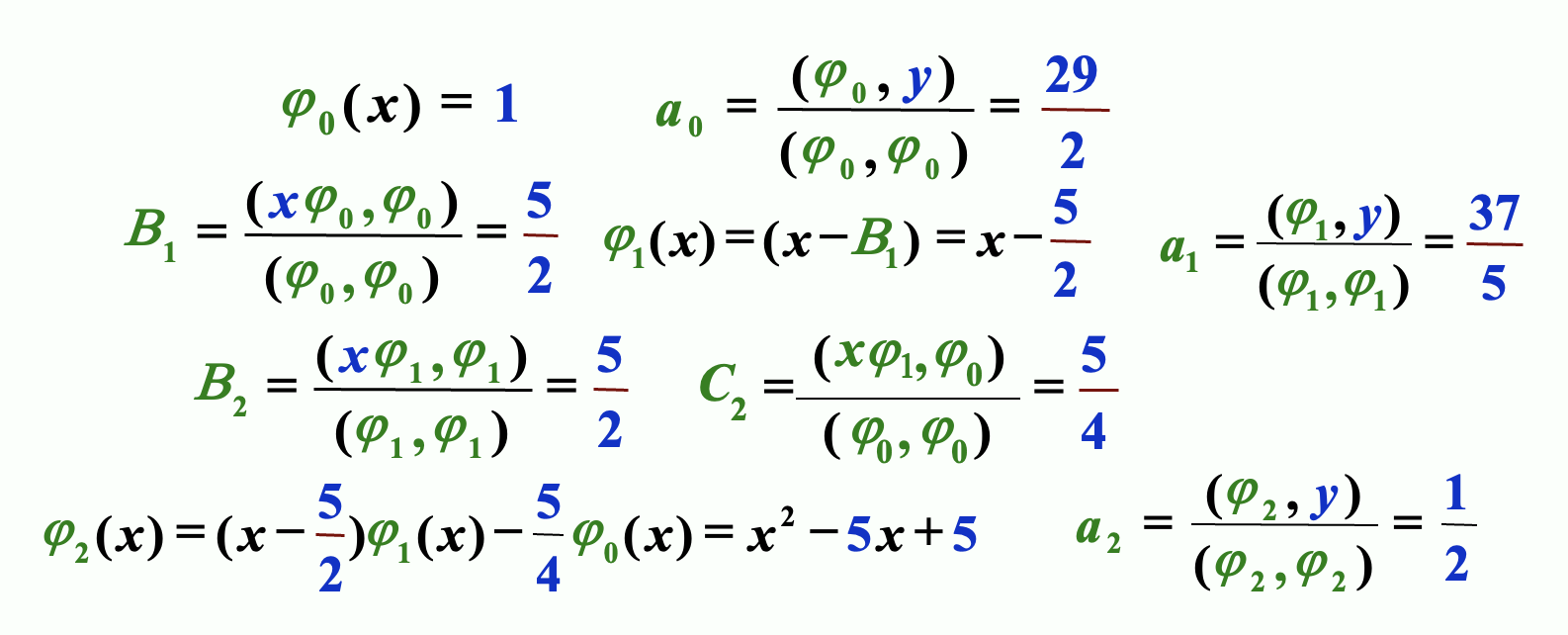 其中 \(B_k = \dfrac{(x \varphi_{k-1}, \varphi_{k-1})}{(\varphi_{k-1}, \varphi_{k-1})}, C_k = \dfrac{(x \varphi_{k-1}, \varphi_{k-2})}{( \varphi_{k-2}, \varphi_{k-2})}\)