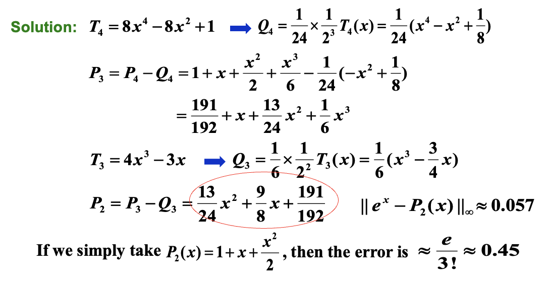 - 另一种方法是用 \(T_0(x), \dots, T_k(x)\) 的线性组合来表示每一项 \(x^k\)。比如,\(x = T_1(x)\),且 \(x^3 = [T_3(x) + 3T_1(x)] / 4\)。然后只要从原始多项式中移除切比雪夫函数就行了。