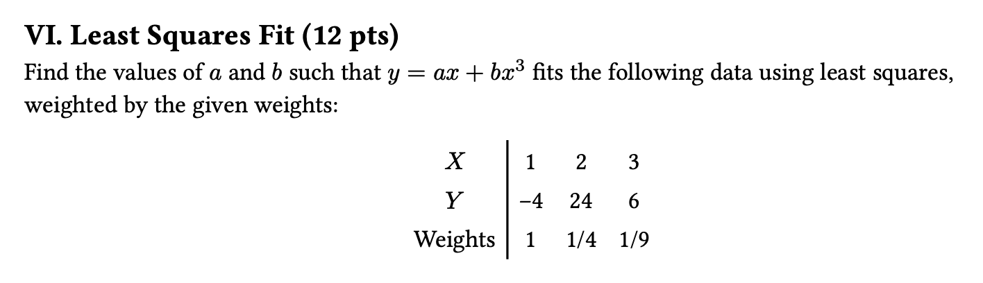 - 得到的偏导数为:\(\begin{cases}\dfrac{\partial S}{\partial a} = 0 \Rightarrow \sum w_i x_i y_i = 0 \\ \dfrac{\partial S}{\partial b} = 0 \Rightarrow \sum w_i x_i^3 y_i = 0\end{cases}\)