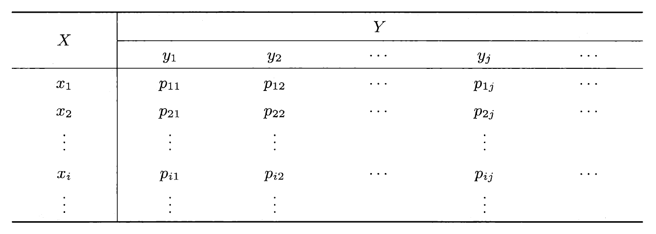 为 \((X, Y)\) 的联合概率分布律,简称联合分布律(joint distribution law)。它的列表法形式为: