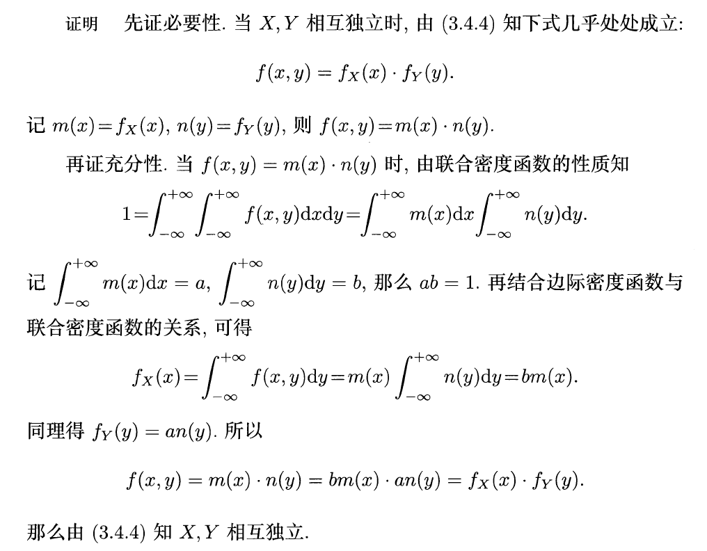 定理:二维连续型随机变量 \(X, Y\) 相互独立的充要条件是 \(X, Y\) 的联合密度函数 \(f(x, y)\) 几乎处处可写成 \(x\) 的函数 \(m(x)\) 与 \(y\) 的函数 \(n(y)\) 的乘积,即: