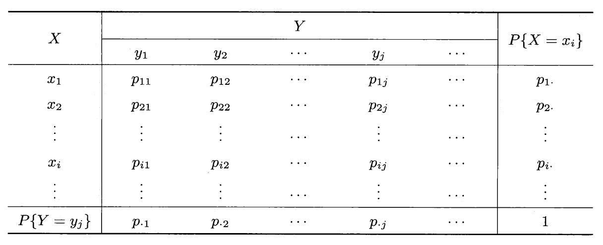 它们分别称为随机变量 \(X\) 与 \(Y\) 的边际分布律(marginal distribution law) 或边缘分布律,可以用以下表格表示: