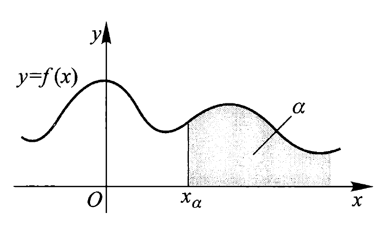 设连续型随机变量 \(X\) 的分布函数和密度函数分别为 \(F(x)\) \(f(x)\),对任意 \(0 < \alpha < 1\),称满足条件 \(P(X > x_{\alpha}) = 1 - F(x_{\alpha}) = \int_{x_{\alpha}}^{+\infty} f(x) \text{d}x = \alpha\) 的实数 \(x_{\alpha}\) 为随机变量 \(X\) \(\alpha\) 分位数。其几何意义如下所示: