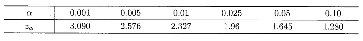 标准正态分布的上 \(\alpha\) 分位数通常记为 \(z_\alpha\),即 \(z_\alpha\) 满足:\(\int_{z_{\alpha}}^{+\infty} \varphi(x) \text{d}x = \alpha\),常用的 \(z_\alpha\) 值如下所示: