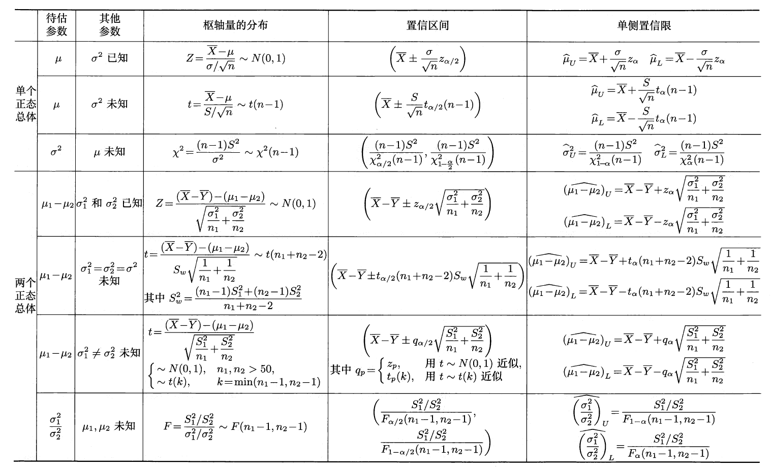 记住不同情况下的枢轴量的分布,以及上面关于枢轴量的结论,我们就可以较为容易地推导出对应的置信区间,无需再额外记忆一堆置信区间的公式了,减轻记忆压力。