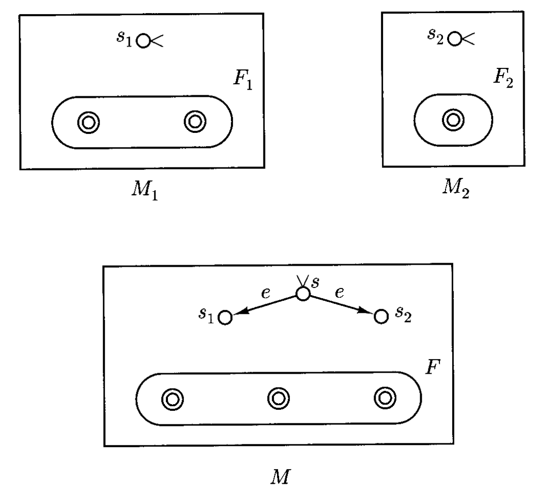 - 形式上,若 \(w \in Sigma^*\),那么 \((s, w) \vdash_M^* (q, e)\ (q \in F)\) 当且仅当 \((s_1, w) \vdash_{M_1}^* (q, e)\ (q \in F_1)\) 或 \((s_2, w) \vdash_{M_2}^* (q, e)\ (q \in F_2)\) 成立