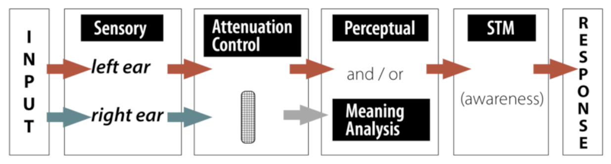 - 过滤器位于知觉和⼯作记忆之间,⽽不是在感知的早期阶段。该模型认为所有的选择性注意都发⽣在信息加⼯的后期,即在知觉和⼯作记忆之间。