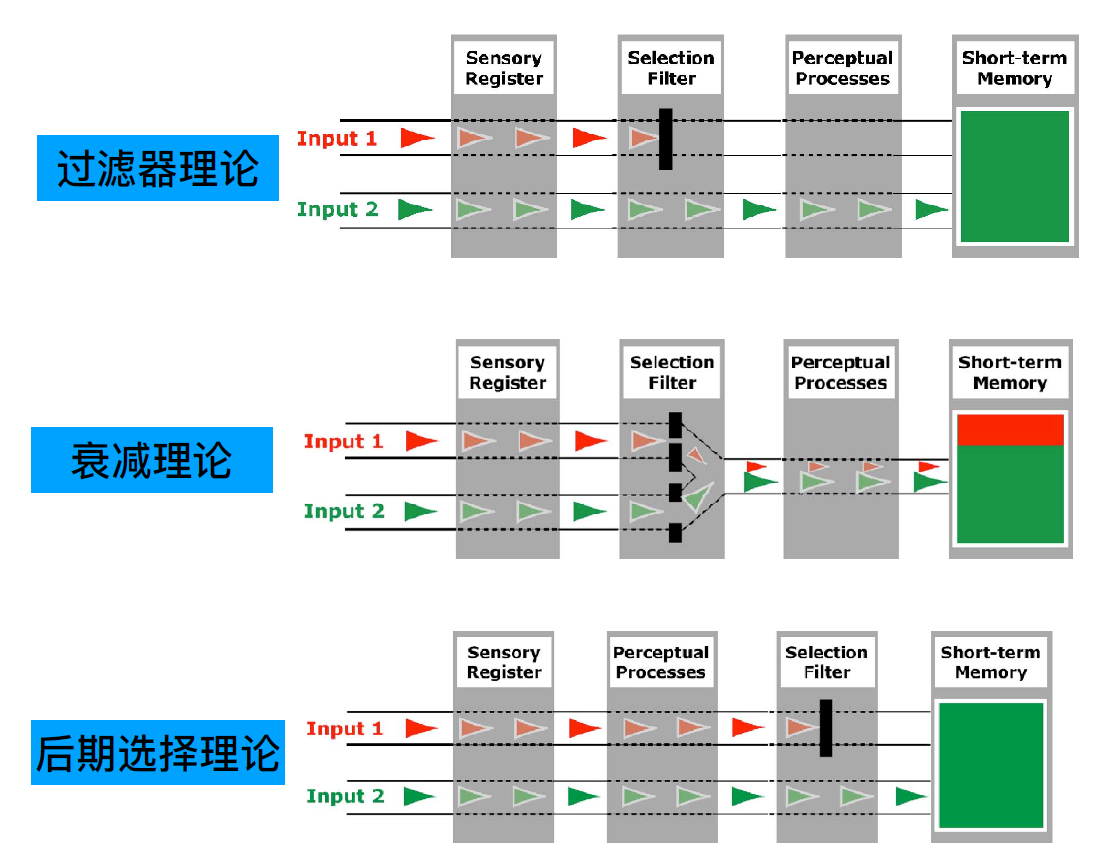 - 过滤器的⼯作⽅式不同:过滤器理论认为过滤器是按“全或⽆”原则进⾏操作的,未被选择的信息通道是关闭的;⽽衰减理论认为⾮追随通道的信息只是衰减了,在达到兴奋阈限时仍可被识别。