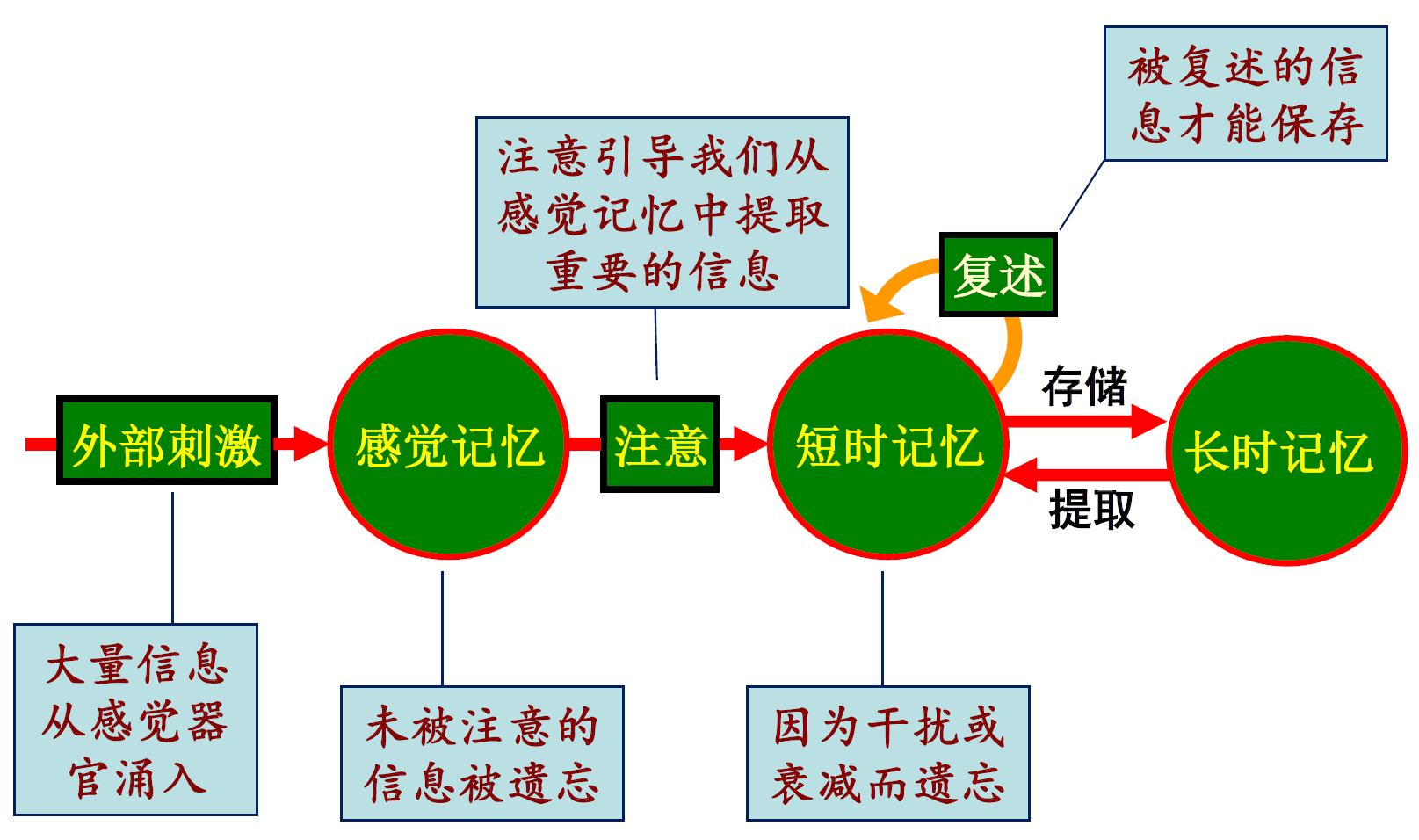 - 遗忘机制不同:短时记忆中信息没得到复述即衰减遗忘;长时记忆的遗忘通常不是信息被擦除,而是由于信息无法提取