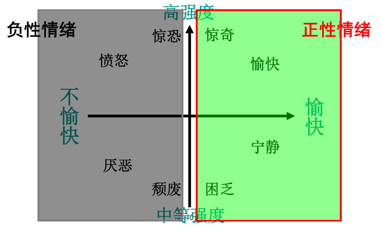 - 积极情绪:表明个体很适应当前环境,当前的状态是安全的,个体只需继续保持这个状态。例如快乐、欣慰、兴奋、兴趣、满足等