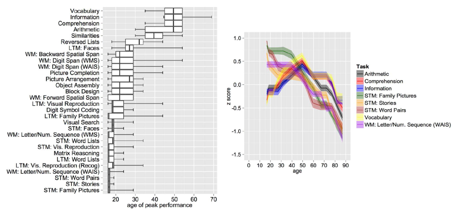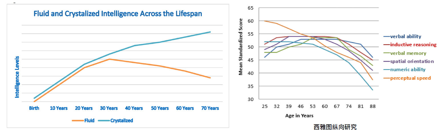 • 流体智⼒随⽣理成⻓曲线⽽变化,到 20 岁左右达到⾼峰,30 岁以后将随年龄的增⻓⽽降低。