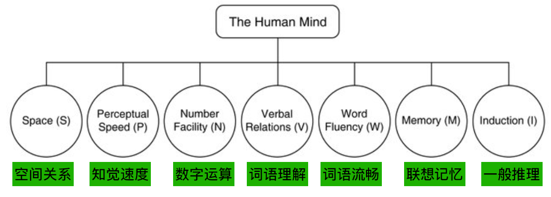 • 智⼒是由七种平等的基本能⼒或原始能⼒构成的,不存在⼀般的因素