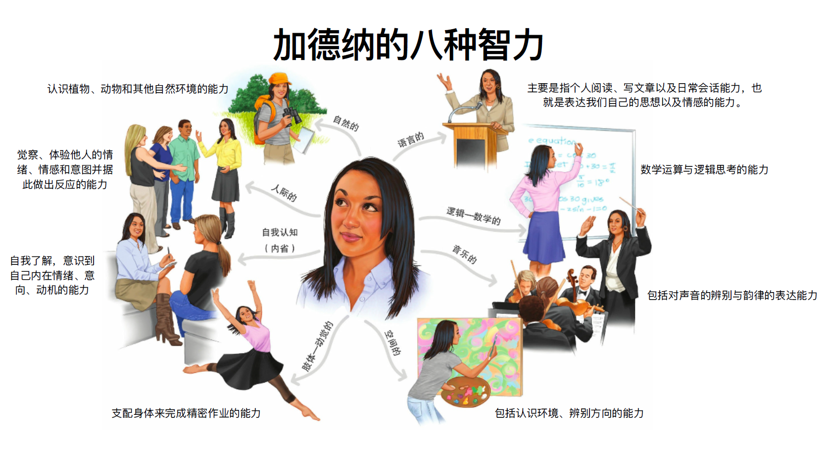 • 智⼒的内涵是多元的,由8 种相对独⽴的智⼒成分构成,每种智⼒都是⼀个单独的功能系统,这些系统相互作⽤产⽣外显的⾏为