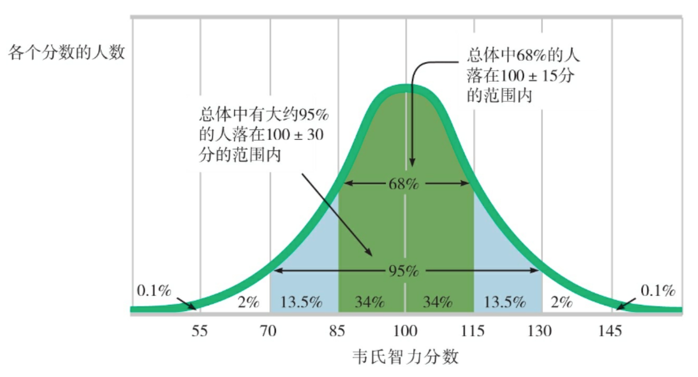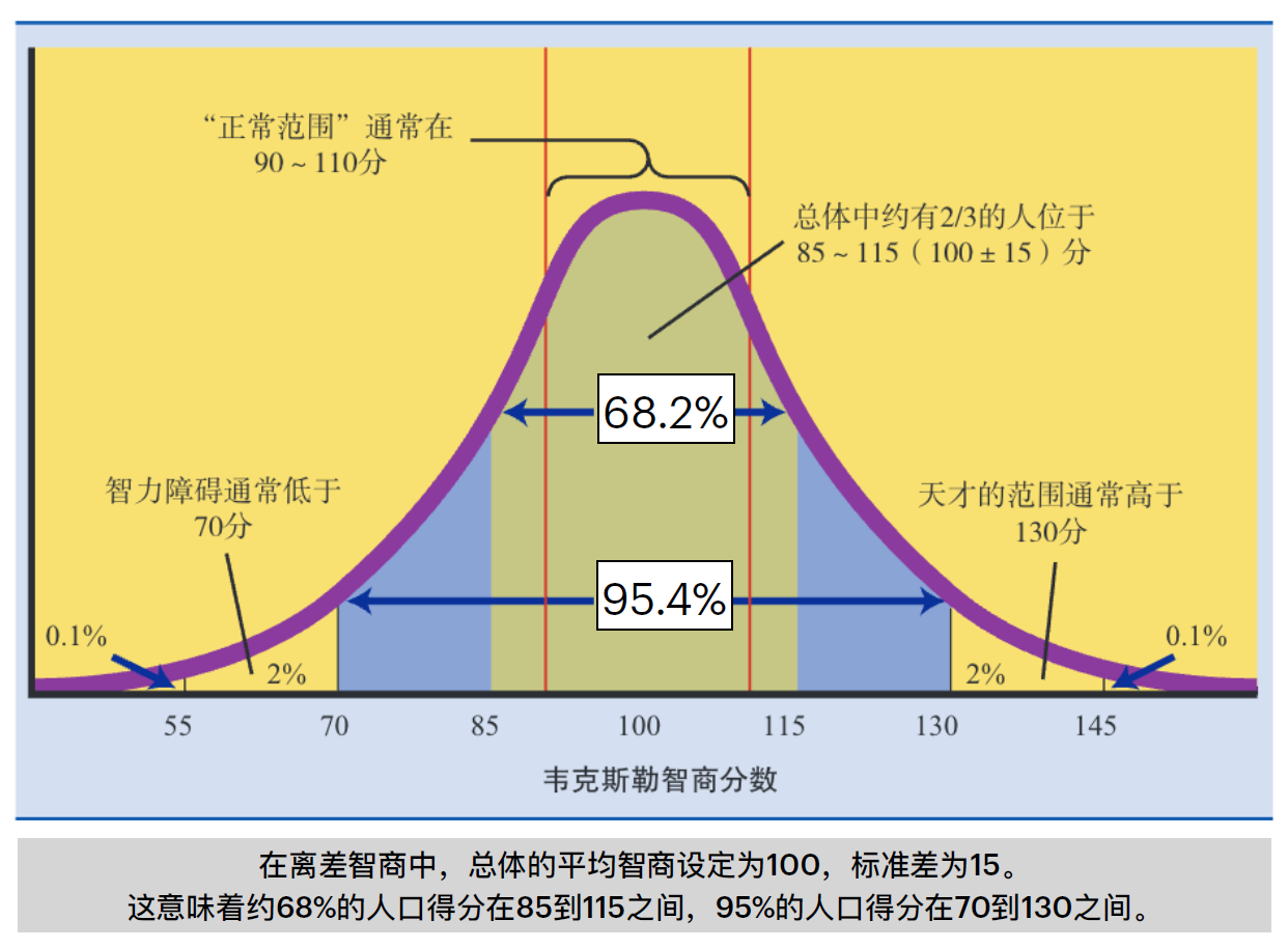 • 智商的概念是由德国⼼理学家 Stern ⾸先提出来的,其计算⽅法如下:\(IQ = \dfrac{智龄}{实龄} \times 100\)