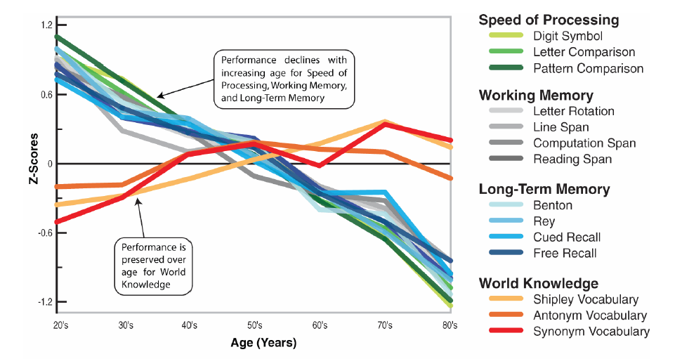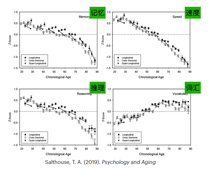 • 晶体智⼒不因年龄增⻓⽽降低,有些⼈由于知识与经验的累积,其晶体智⼒反⽽呈随年龄增⻓⽽升⾼的趋势