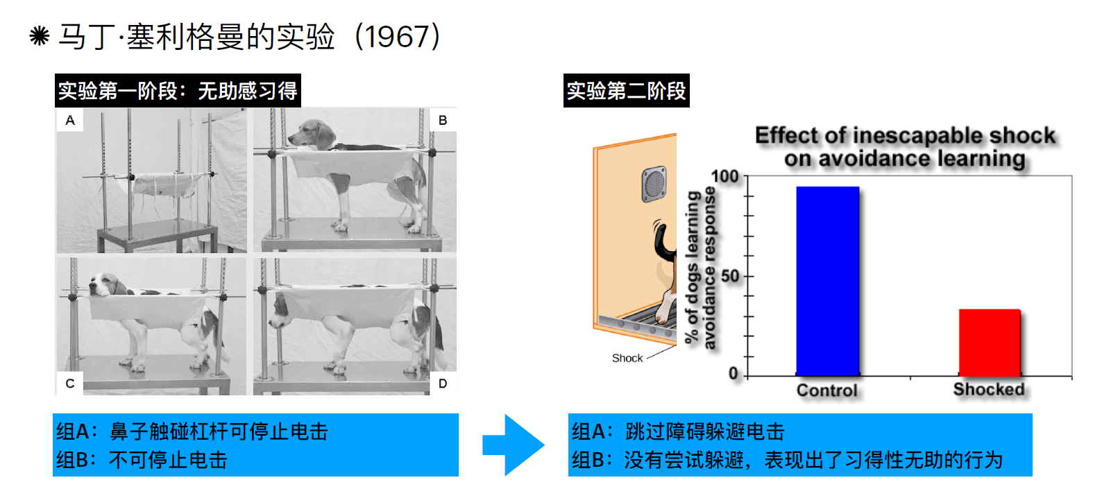 • 人类也会产生习得性无助。如果反复面对个体无法控制的创伤事件,人们就会变得无助、绝望和抑郁。
