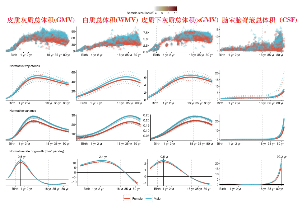 • 从妊娠中期到⼉童早期,脑⽩质(⼤脑连接和信号传递)的数量也迅速增加,并在 28.7 岁时达到峰值。50 岁后,脑⽩质体积的开始加速下降。