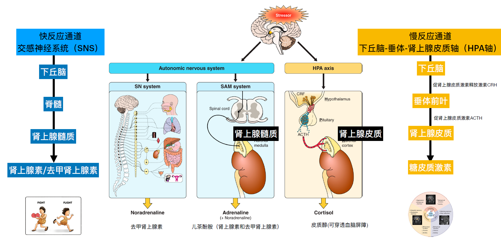 压力对认知和情绪的影响:压力能够引起大脑结构和功能的变化,尤其是在海马体、前额叶皮质和杏仁核这三个区域。这些区域的变化与认知和情感功能障碍有关,并且与 HPA 轴(下丘脑 - 垂体 - 肾上腺轴)的调节有关。