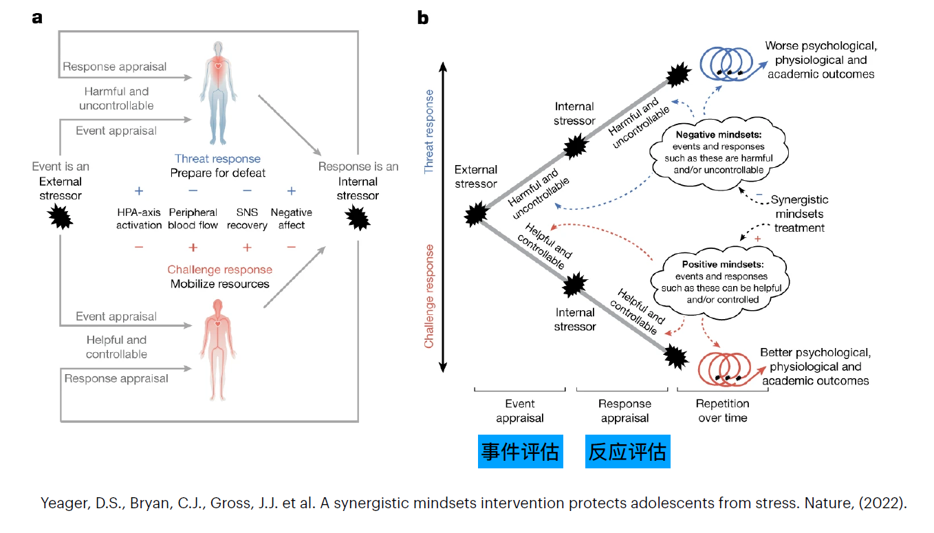 • 压力提升心态(the stress-can-be-enhancing mindset)“生理和心理的压力反应是积极且可控的”的信念,这种心态可以改善青少年对压力反应的评价,即将压力反应视为身体准备克服挑战的信号。