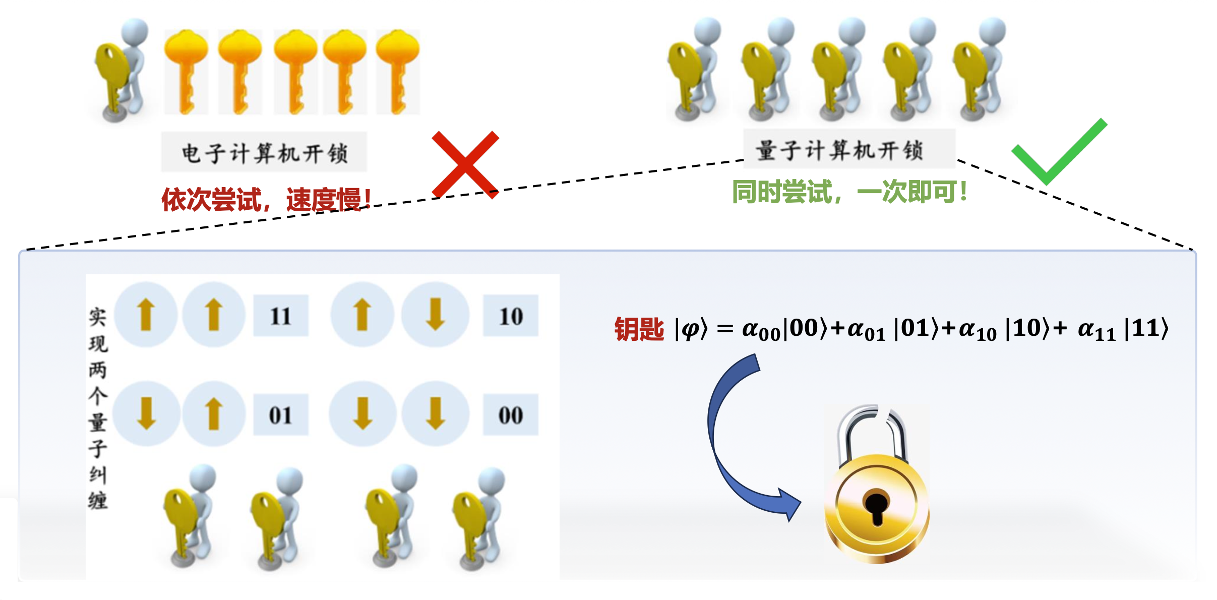 - 研究人员可以制备“纠缠”的量子比特对,即是说一对量子比特对的两个量子比特存在于单个量子状态