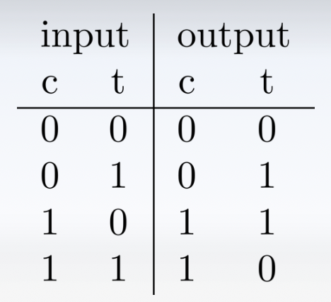 - 如果其中任何一个或两个控制比特处于 \(|0\rangle\) 状态,它不会执行非门操作,目标比特保持不变