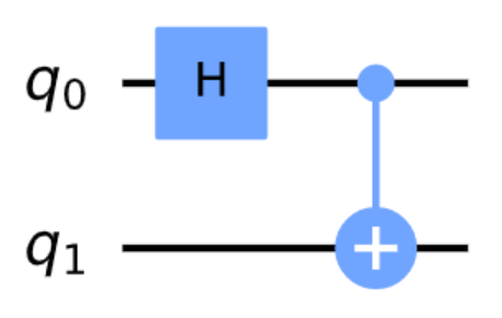 CNOT 门的一大作用是用于制备纠缠态。以量子态 \(|q_0 q_1\rangle = |00\rangle\) 为例,首先 \(q_1\) 通过一个 H 门:再将 CNOT 门作用在两个量子比特上,则有: