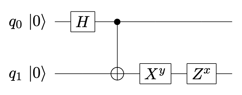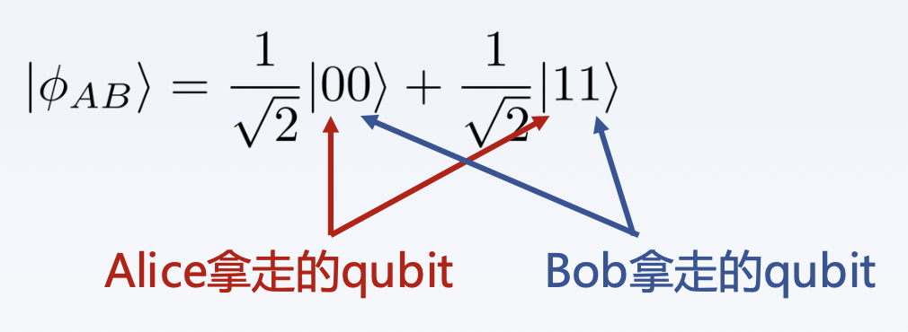 假设 Alice 和 Bob 是一对老朋友,他们上一次见面的时候各自拿走了一对处于贝尔态的纠缠 qubits 中的一个,也就是说: