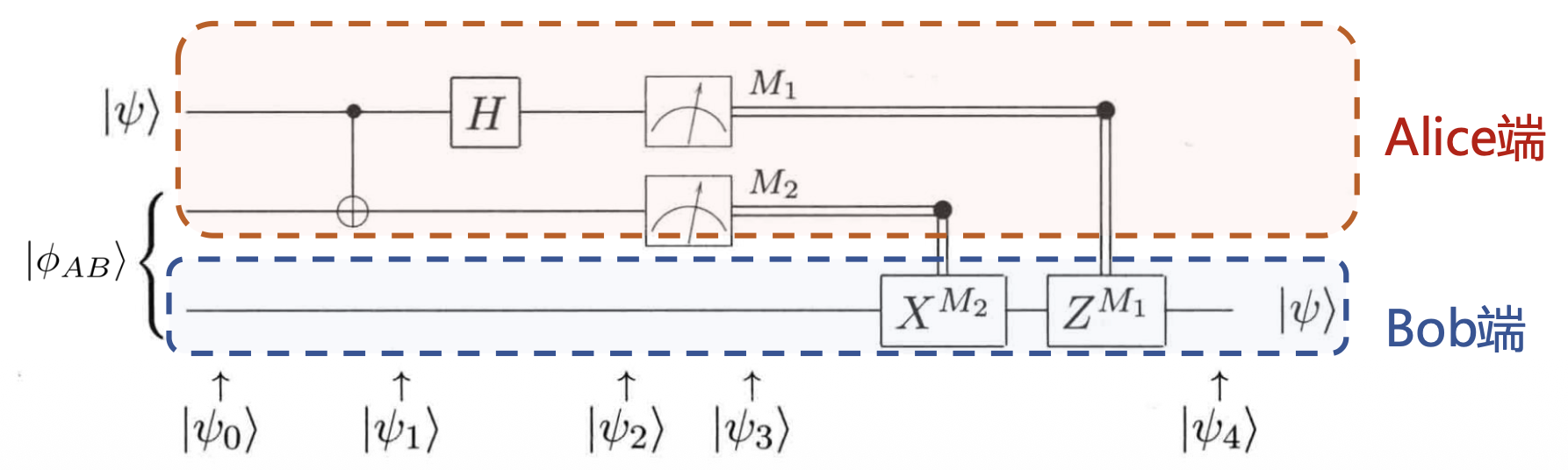 现在,Alice 可以测量持有的 qubits,并将结果通过经典信道发送给 Bob,这只需要两个经典 bit 的数据;反过来,Bob 可根据接收到的经典数据对持有的 qubit 进行操作,进而恢复 \(|\psi\rangle\)。
