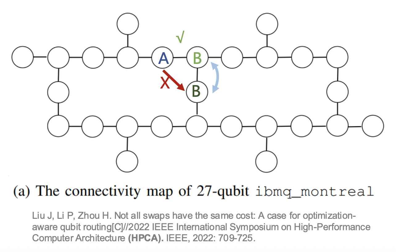 由于现阶段量子计算机中量子比特的连接性问题,两个逻辑上可以进行多比特门操作的量子比特,在硬件上可能并不相邻,这就需要 SWAP 操作将物理比特的量子比特“交换”后再进行多比特门操作。SWAP 操作也因此成为量子线路编译及优化中常用的技术。