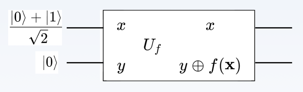 考虑输入 \(|x\rangle\) 为:\(\left[\frac{|0\rangle+|1\rangle}{\sqrt{2}}\right]\),因此 \(U_f\) 的输出为: