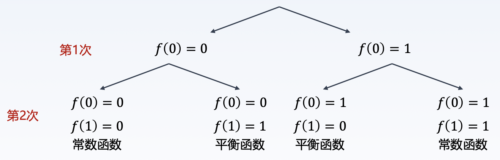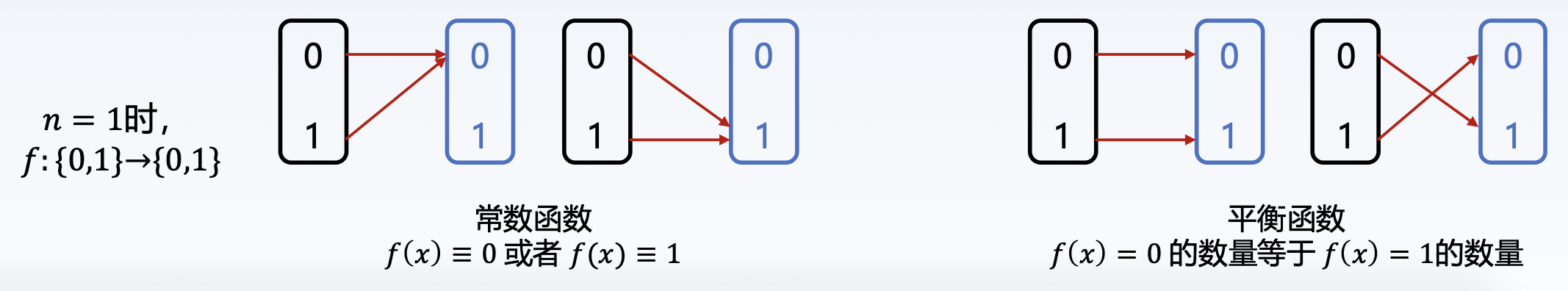 用 \(x \in \{0, 1\}^n\) 来表示由 \(0\) 或 \(1\) 组成的任意 \(n\) 为二进制数,例如 \(n = 3\) 时,一个可能的二进制数为 \(010\). 我们定义在 \(n\) 位长度二进制数上的映射函数 \(f\),它分为两种情况: