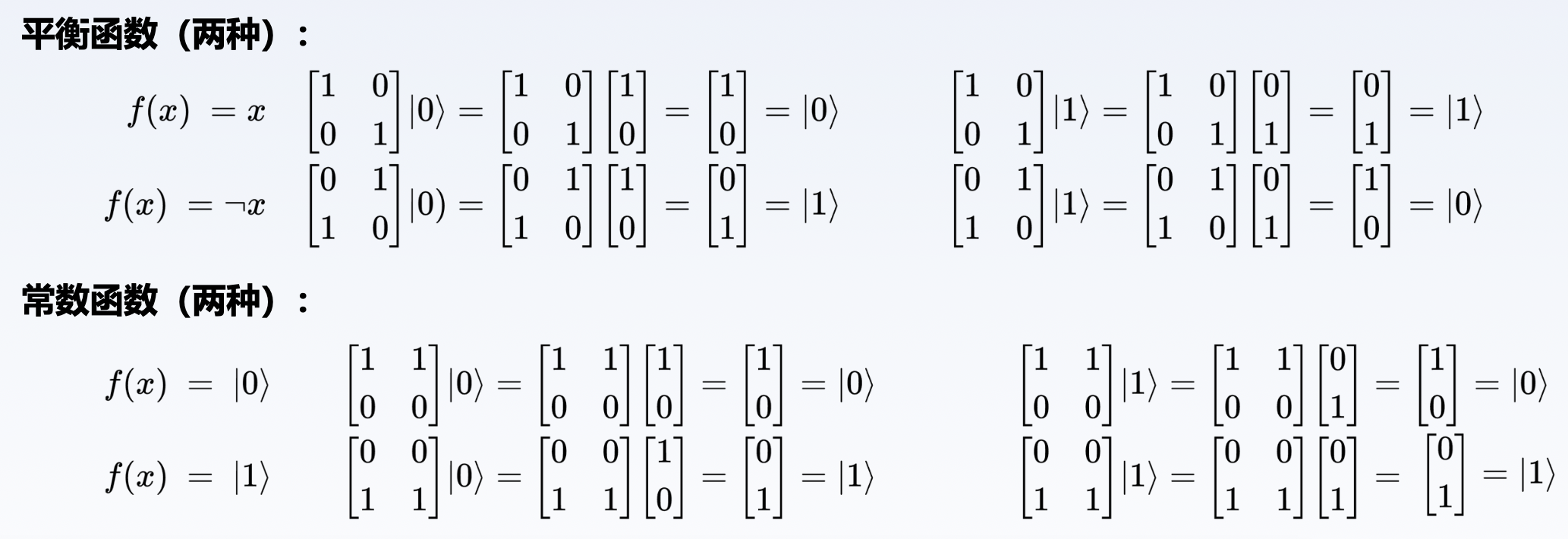 而对于量子计算机算法,单量子比特 4 种可能操作及对应 \(f\) 算子如下: