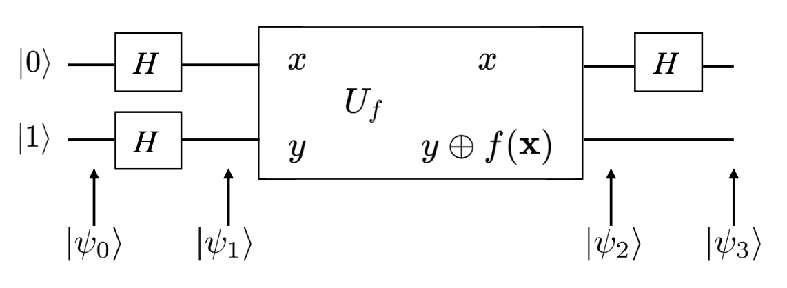 初始态: $$ |\psi_0\rangle = |0\rangle^{\otimes n}|1\rangle $$