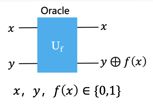 因此,首先我们需要设计一个量子线路,它包含我们需要进行判断的函数 \(f(x)\) ,可以传入一些量子比特,然后输出另外一些量子比特,并且可以让我们从输出的量子比特中一眼就可以看出其是常量函数还是平衡函数。 $$ U_f:|x\rangle|y\rangle\to|x\rangle|y\oplus f(x)\rangle $$