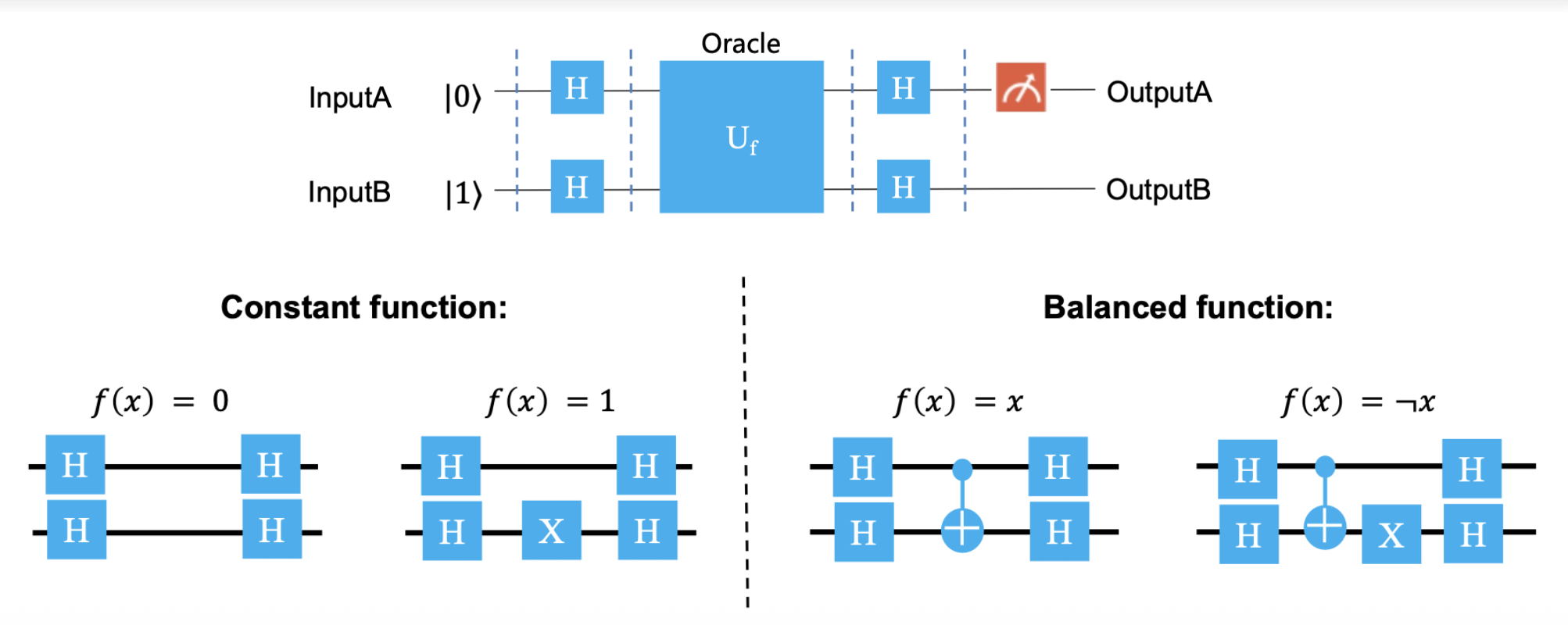 下面将推导该量子电路中量子态的演化过程,并说明如何基于测量结果判断 f 是常数函数还是平衡函数。