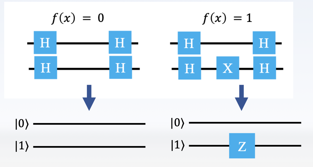 由于异或计算的特性,我们有: $$ |x\rangle|y\rangle \overset{U_f}{\longrightarrow} |x\rangle|y \oplus f(x)\rangle = |x\rangle(-1)^{f(x)}|y\rangle $$