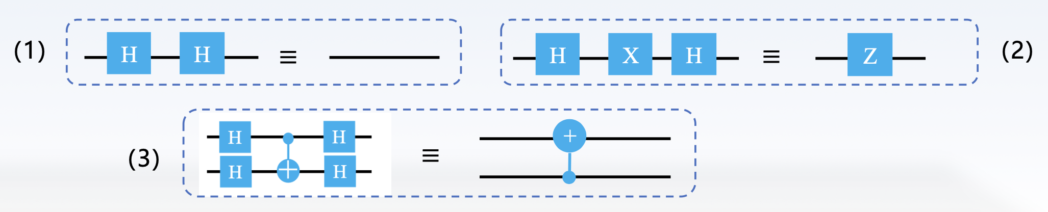 我们可以分别施加 H 门在两个 qubits 的初态 0 上,得到: $$ x=(\frac{|0\rangle+|1\rangle}{\sqrt{2}})(\frac{|0\rangle+|1\rangle}{\sqrt{2}})=\frac{|00\rangle+|01\rangle+|10\rangle+|11\rangle}{2} $$