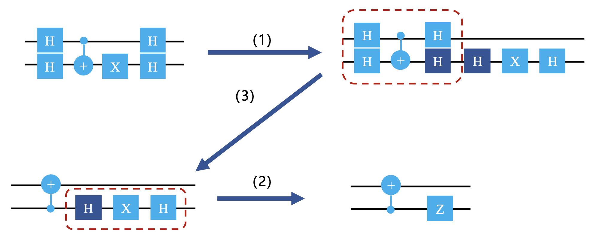 对第一个 qubit 施加 H 门,这可以把第一个 qubit 复原为 \(|0\rangle\) 或者 \(|1\rangle\):