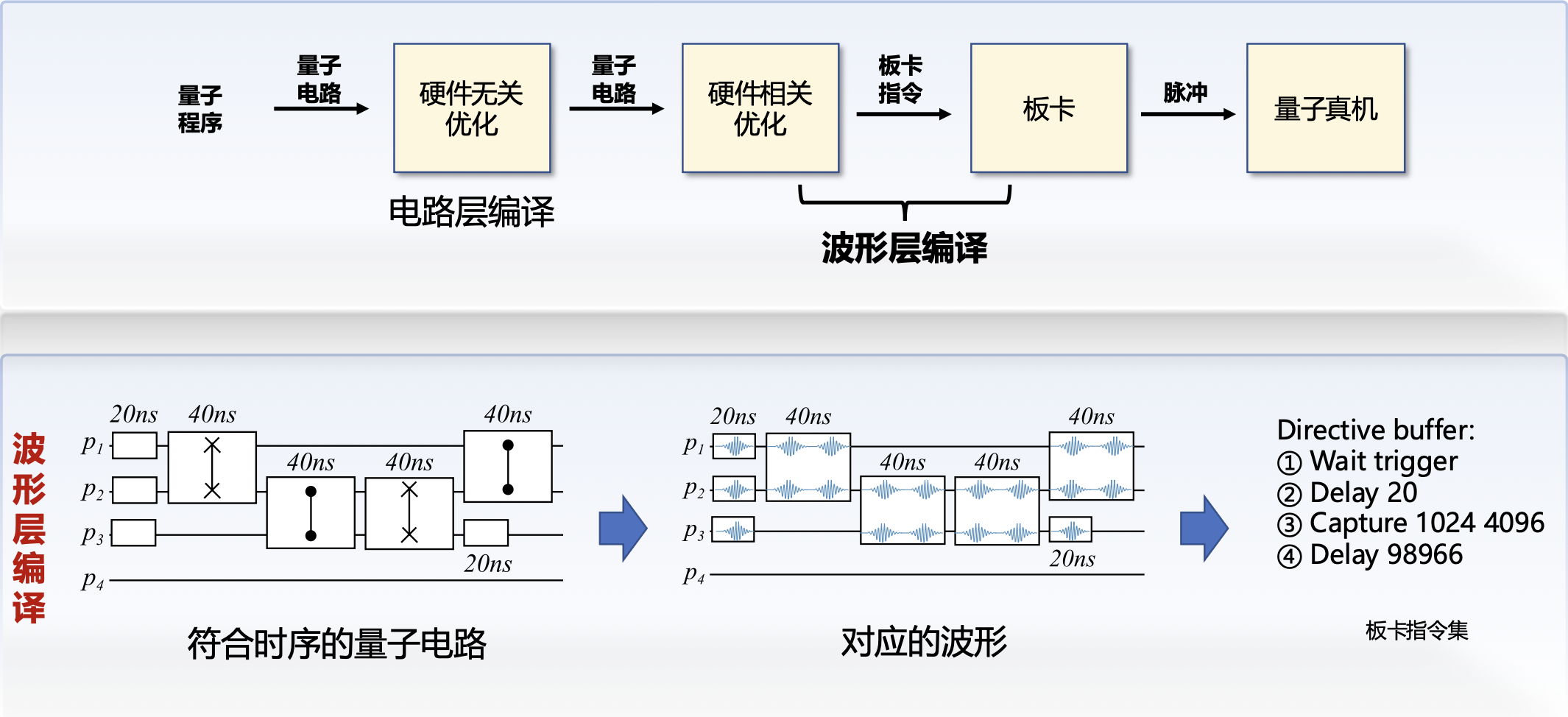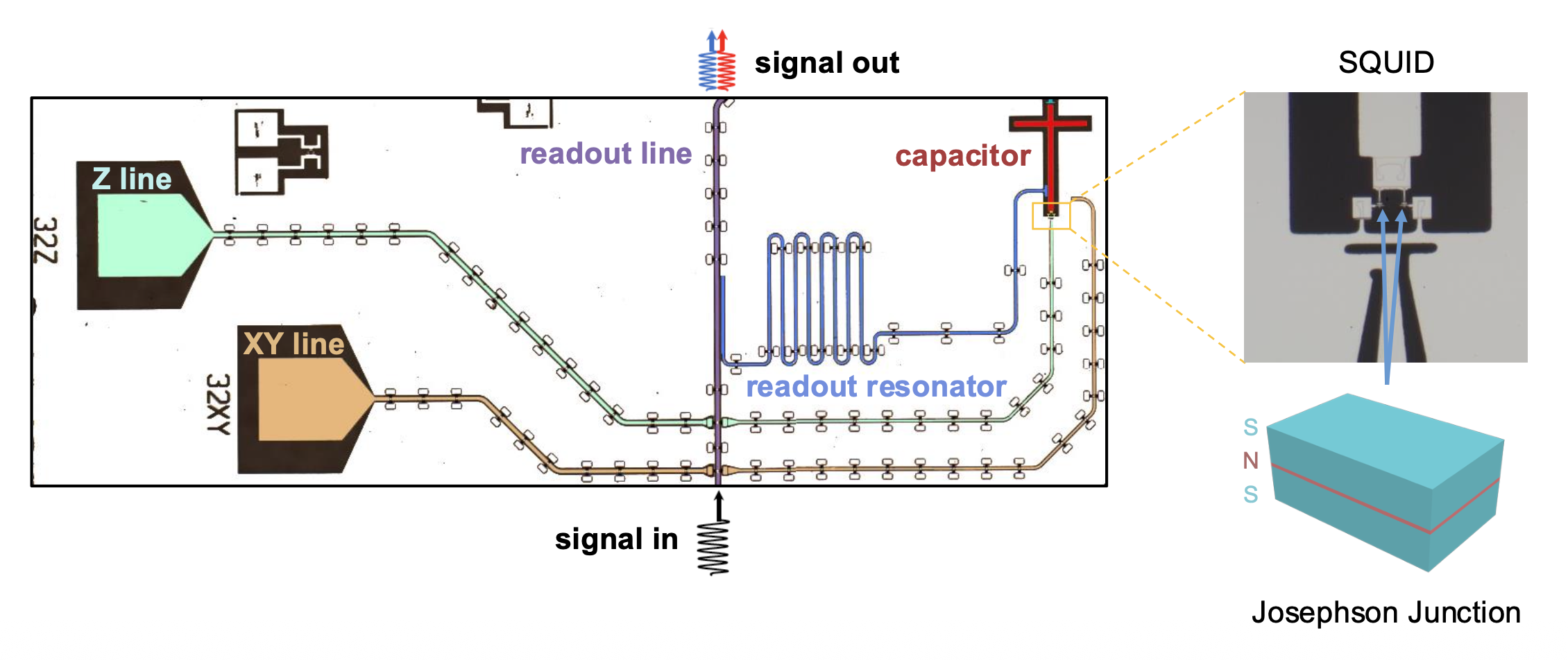 - 右侧为具有分立能级的量子比特具体结构,左侧展示了量子比特的操纵和读取结构