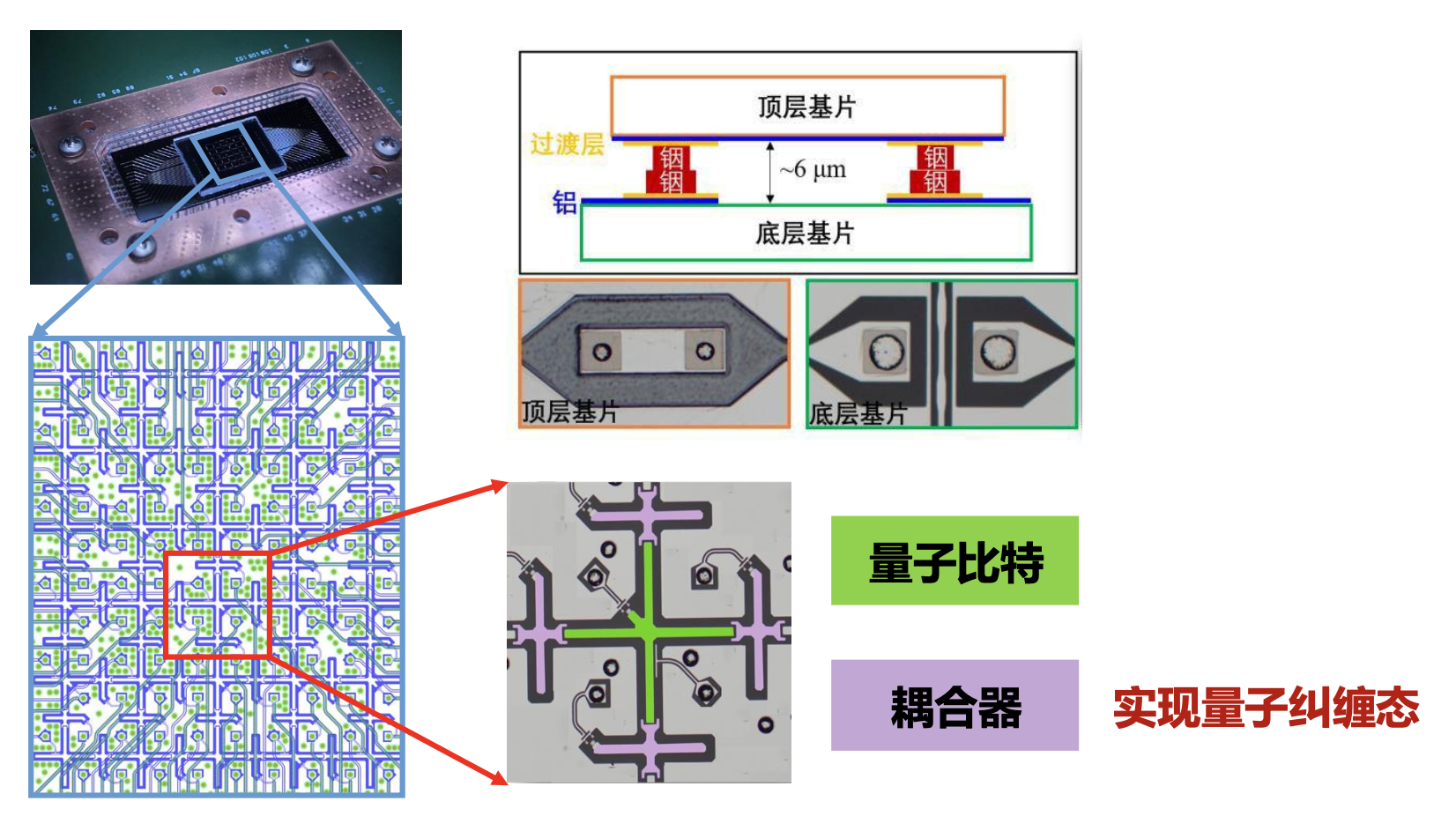 - 超导量子芯片通过封装工艺集成了多个量子比特,这些量子比特通过耦合器连接,并实现相互作用