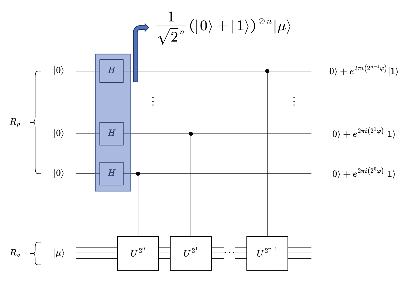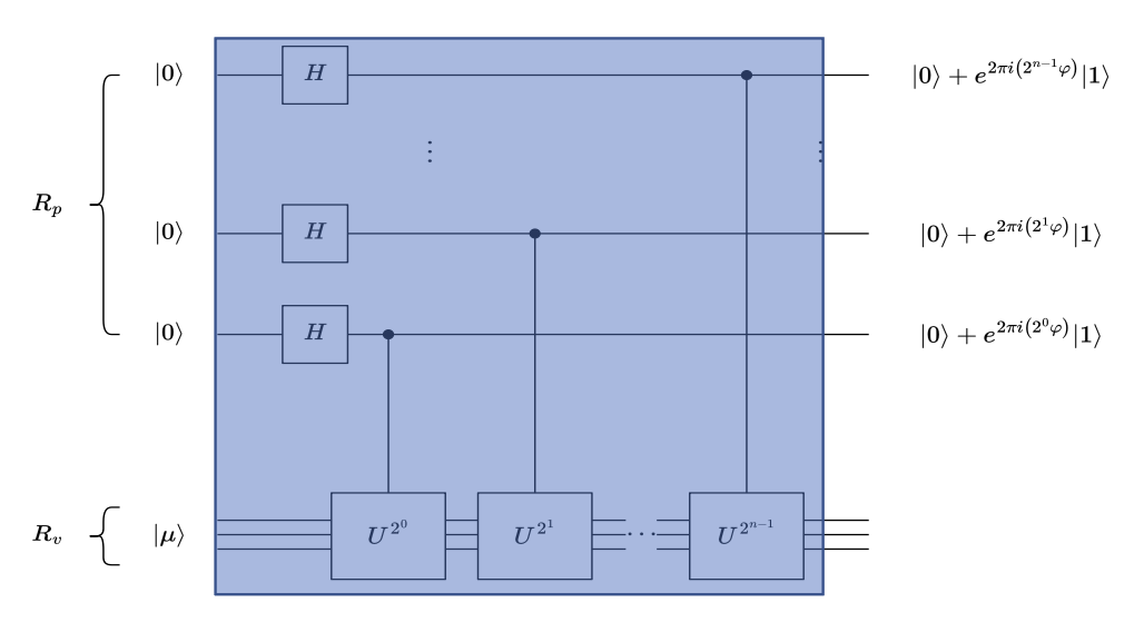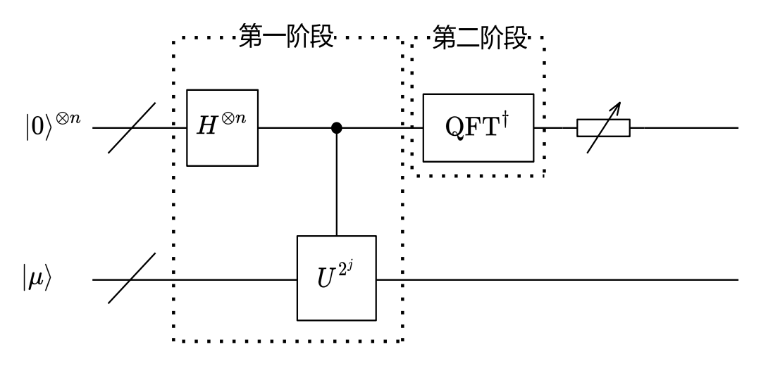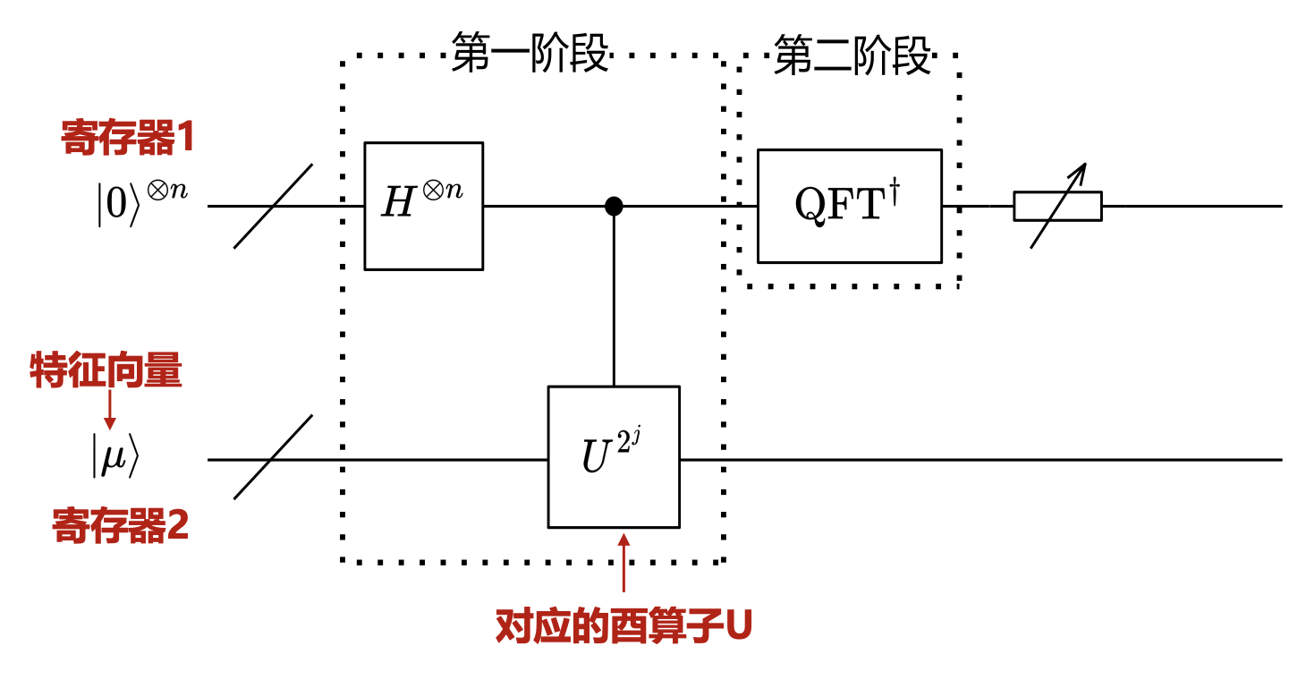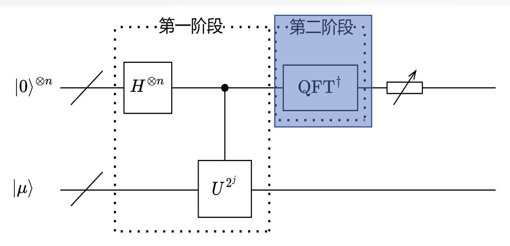 - 初始化:准备两个量子寄存器,一个存储相位估计结果,另一个存储本征态 \(|\mu\rangle\)