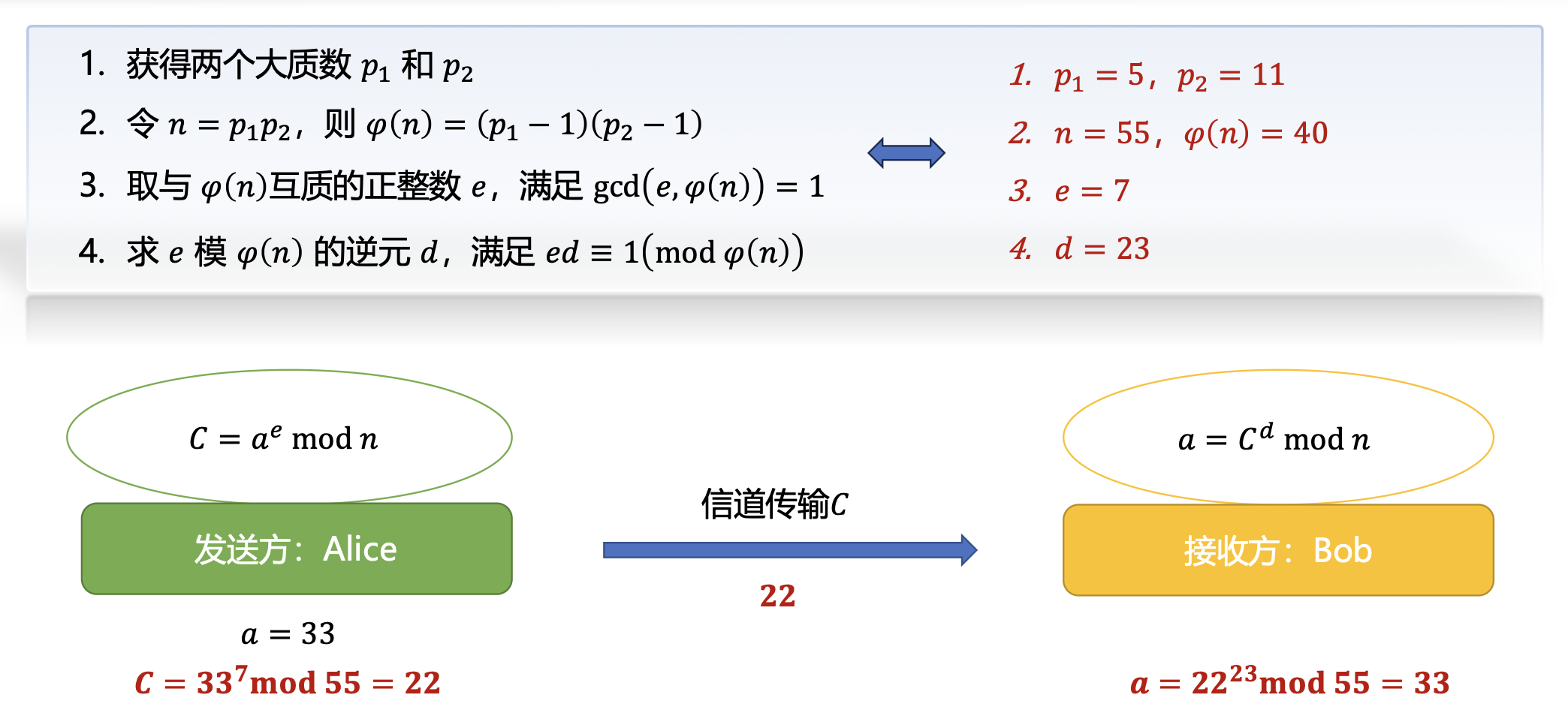 - 取与 \(\varphi(n)\) 互质的正整数 \(e\),满足 \(\text{gcd}(e, \varphi(n)) = 1, e \neq p_1, p_2\)