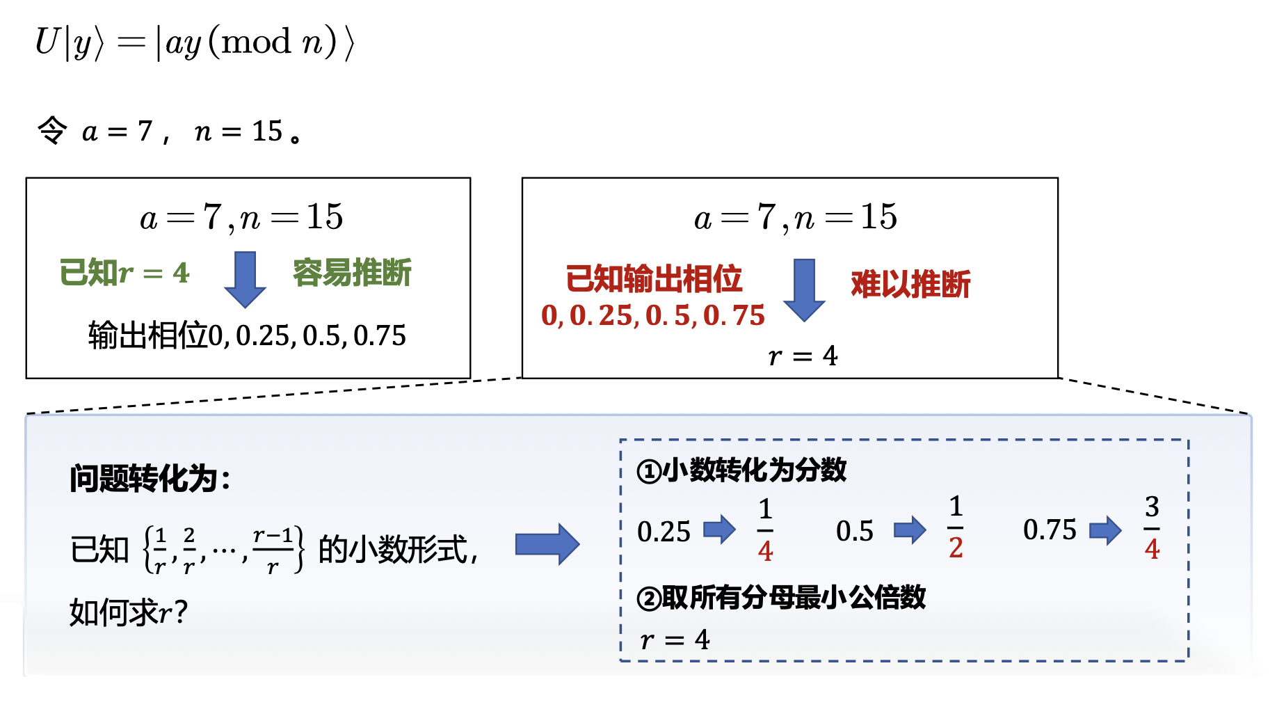 \[ |u_s\rangle = \frac{1}{\sqrt{r}} \sum_{k=0}^{r-1} e^{-\frac{2\pi isk}{r}} |a^k \pmod N\rangle \]- 性质 1:\(U|u_s\rangle = e^{\frac{2\pi is}{r}} |u_s\rangle\)