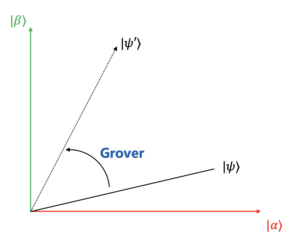 初始状态:\(|\psi\rangle = \sqrt{\frac{N-M}{N}} |\alpha\rangle + \sqrt{\frac{M}{N}} |\beta\rangle\)
