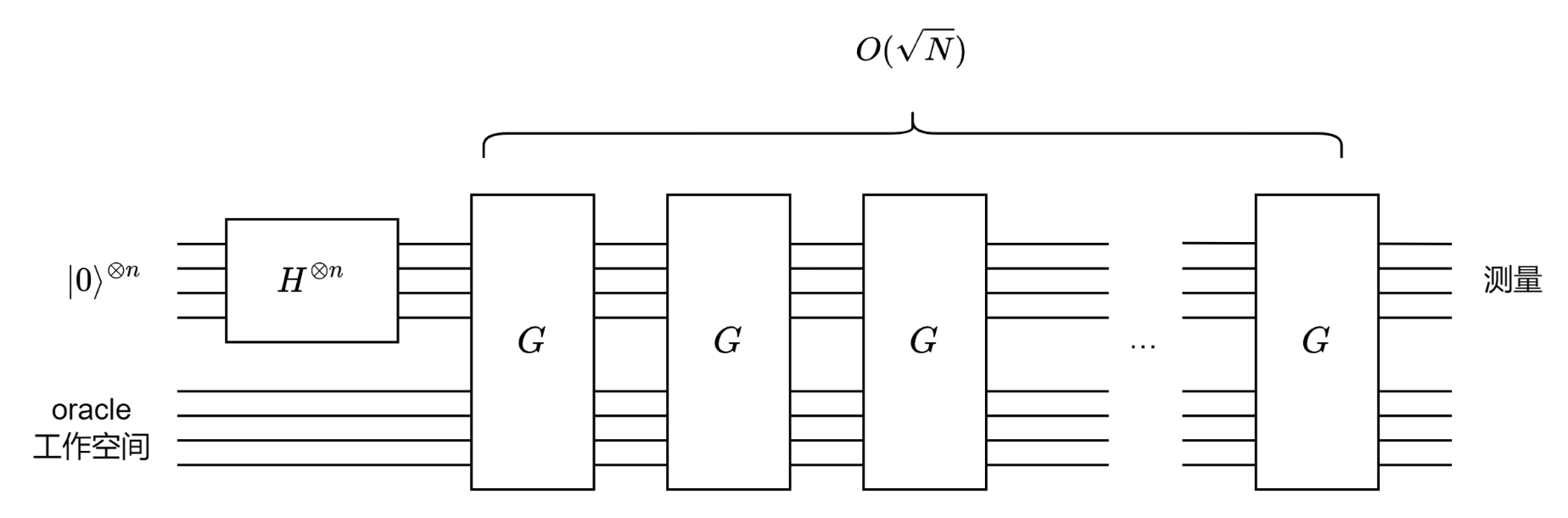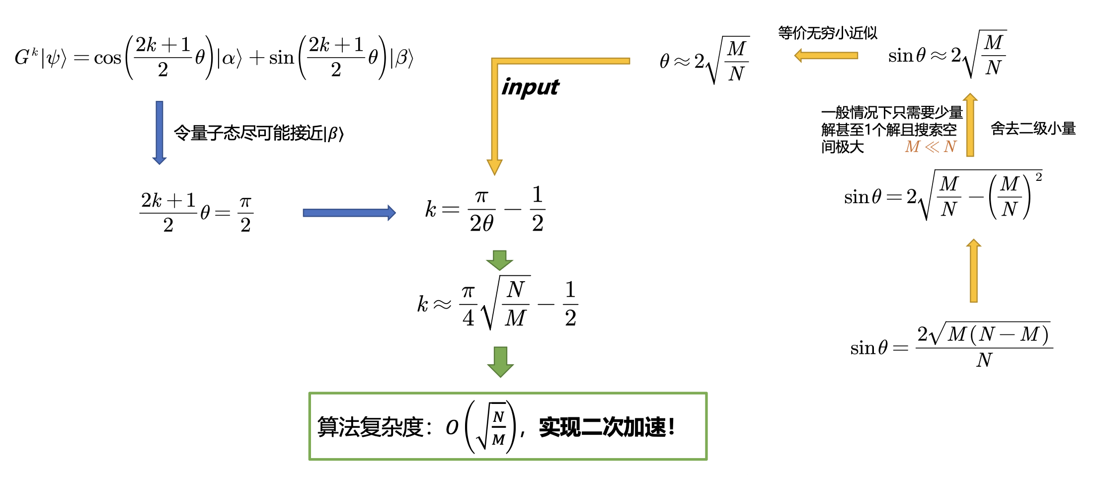 - 初始状态为 \(|\psi\rangle = \sqrt{\frac{N-M}{N}} |\alpha\rangle + \sqrt{\frac{M}{N}} |\beta\rangle\)