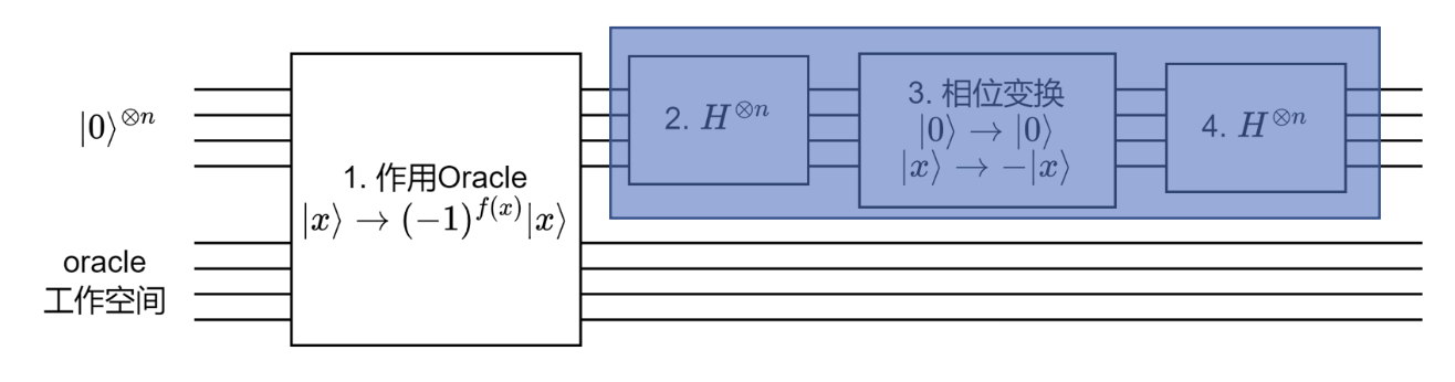 于是 \(H^{\otimes n} (2|0\rangle\langle 0| - I) H^{\otimes n} = 2|\psi\rangle\langle\psi| - I\)。