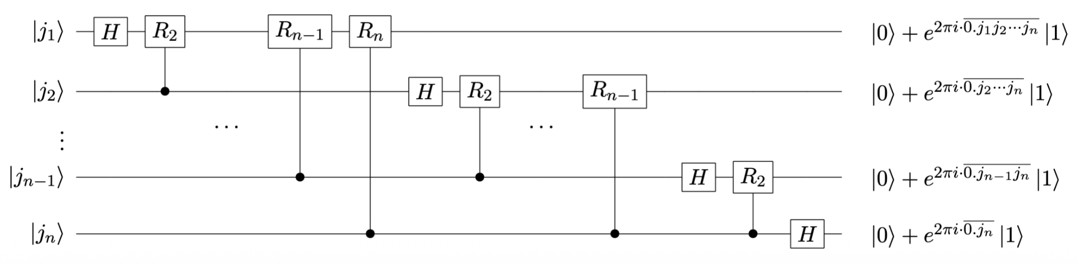 QFT 张量积形式: $$ \frac{1}{\sqrt{2^n}} \left( |0\rangle + e^{2\pi i 0.\overline{\varphi_n}} |1\rangle \right) \left( |0\rangle + e^{2\pi i 0.\overline{\varphi_{n-1}\varphi_n}} |1\rangle \right) \cdots \left( |0\rangle + e^{2\pi i 0.\overline{\varphi_1\varphi_2\cdots \varphi_n}} |1\rangle \right) $$