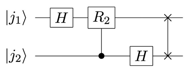 由上述分析可知,双比特的 QFT 量子电路如下所示: