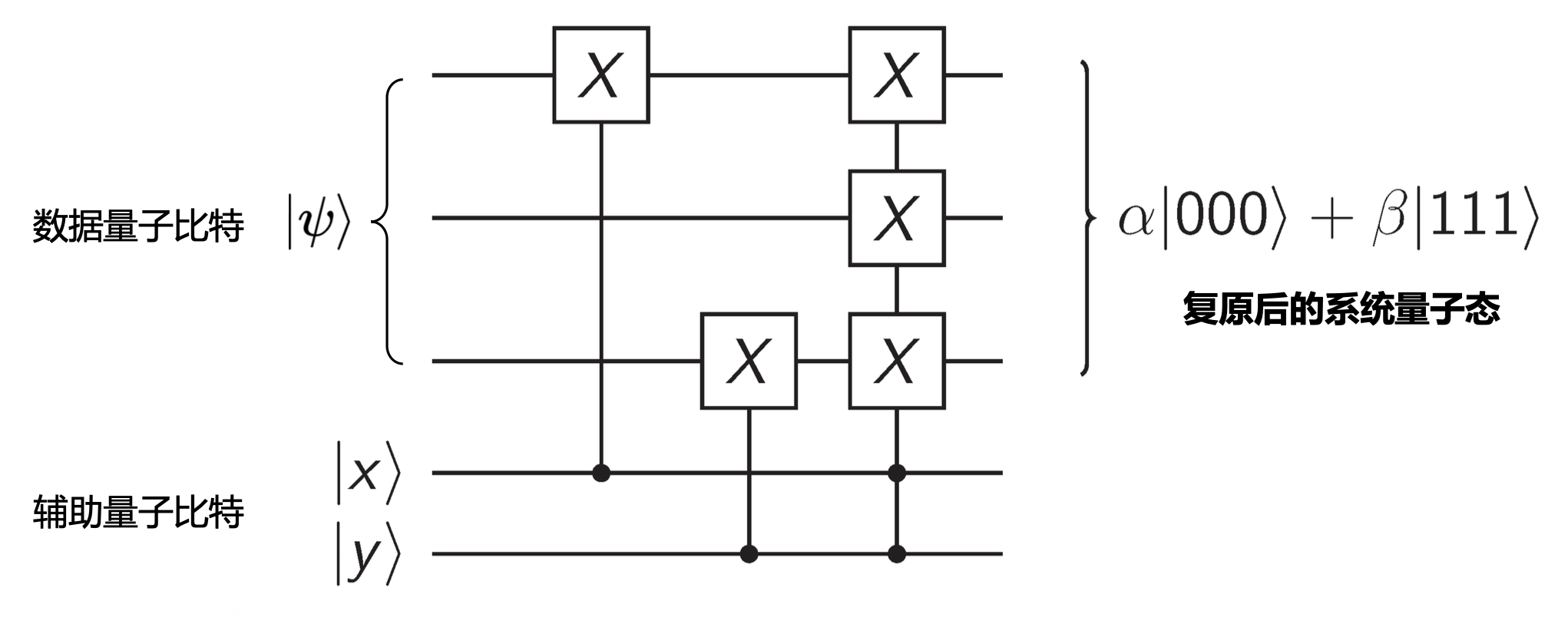| 翻转两个数据比特 | \(\alpha\|011\rangle + \beta\|100\rangle\) \(\alpha\|110\rangle + \beta\|001\rangle\) \(\alpha\|101\rangle + \beta\|010\rangle\) |