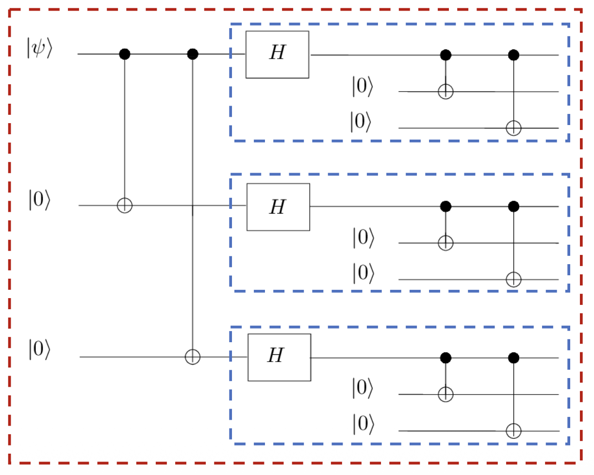 通过这样的嵌套,九个物理比特被编码为一个能够同时容忍比特和相位翻转错误的逻辑比特!